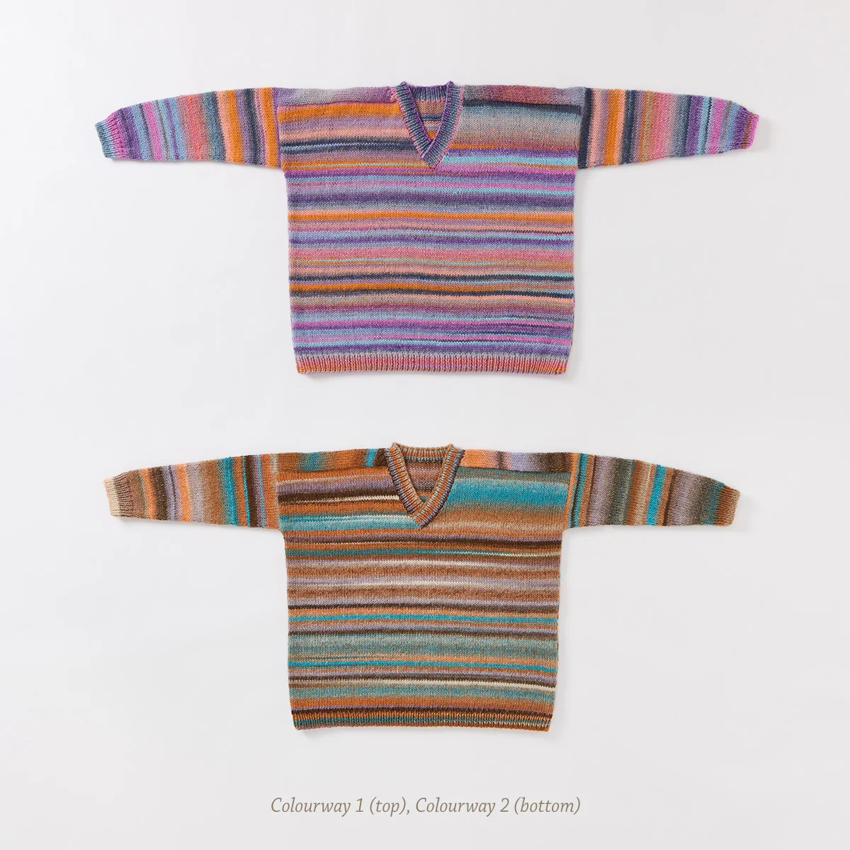 The Lyric Jumper is knit in pieces from the bottom up and seamed. The oversized, dropped shoulder design features a shaped saddle at sleeve top and an overlapping v-neckband. Intermediate skills required for finishing. The colour effects of Cleckheaton Verve 12 ply elevate this jumper from simple to radiant. Model wears size M.